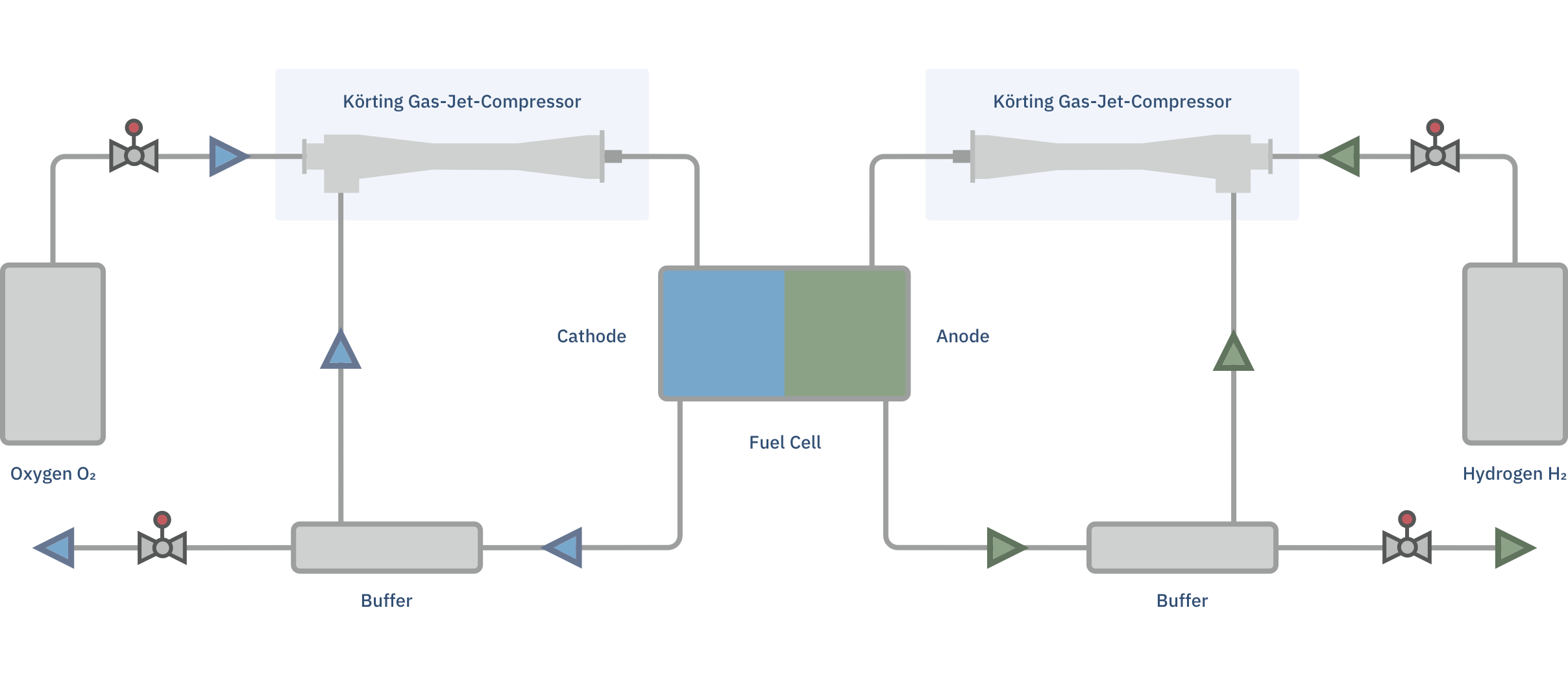 • The ejector principle means the fresh hydrogen is injected through a jet ejector, creating a vacuum that suctions in the gas blend. The advantage: no extra energy consumption and installation space and weight are saved.