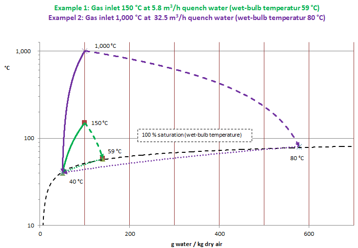 Typical usage: A 150°C hot gas flow (example 1, see diagram) or one at 1,000°C (example 2, see diagram) and a mass flow of 1,100 kg/h (water content 0.1 kg per kg of dry air) is cooled down with quench water of 30°C to a gas outlet temperature of just 40°C. This is a prime example of process control at maximum efficiency.