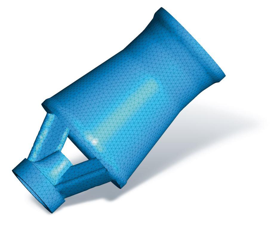 The whole simulated geometry consisting of all liquid jet mixing nozzles and the tank with pump connection is converted to a calculation grid by means of a so-called grid generator which is the basis of the CFD. The fluidic fundamental equations are solved for each of the cells generated within the grid.